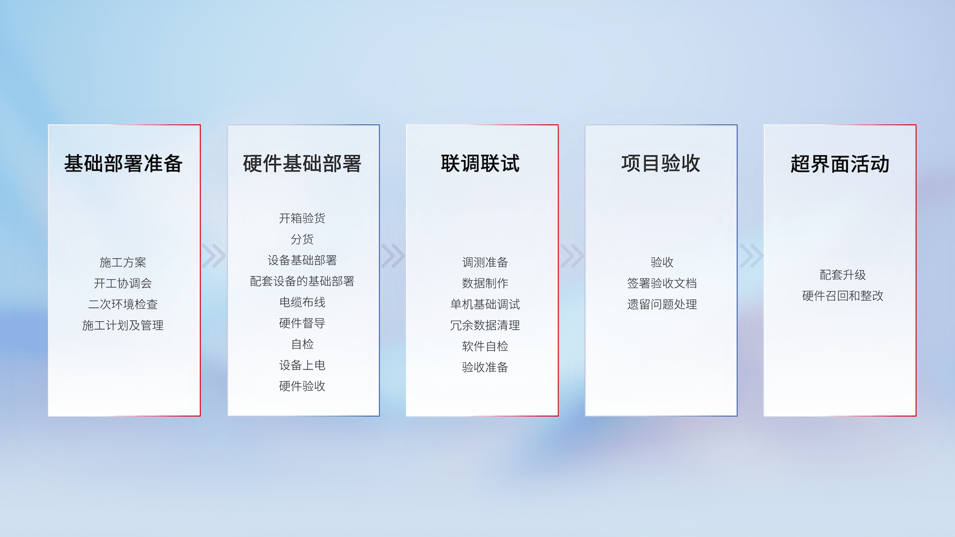 从基础部署准备、、、硬件基础部署、、、联调联试、、、、项目验收、、、、越界面活动的全过程可追溯,,,保证施工质量和进度。。